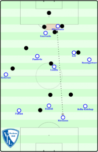 Ein oft vorkommender Fehler im Abwehrbund beschert dem VfL den Ausgleich – schlechtes Verschieben. Die Viererkette verschiebt in Richtung des Balles, doch ist die Übergabe der jeweiligen Mannorientierungen noch nicht vollendet, während Jannik Bandowski bereits die Flanke schlägt. Linksverteidger Kral befindet sich also noch im Rücken von Ganvoula, der so in die Lücke zwischen ihm und Innenverteidger Breitkreuz gelangen und zum Ausgleich einköpfen kann.