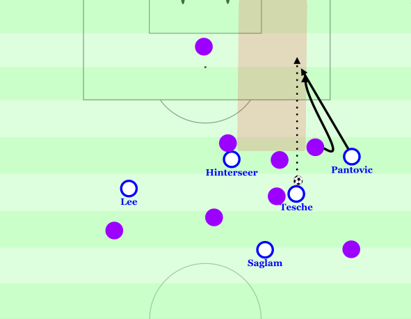 Beim ersten Gegentreffer ist es gleich eine Ansammlung mehrerer Fehler. Angefangen mit Robert Tesche, der noch in der gegnerischen Hälfte eine Mannorientierung zu einem Spieler aufrecht erhält, der durch Saglams Deckungsschatten sowieso nicht anspielbar war. Er hätte sich weiter links orientieren müssen, um das Feld in Ball-Nähe weiter zu verengen. Fraglich ist sein Verhalten vor allem, weil er mit dem Schulterblick genau die betreffende Zone anschaut und eigentlich auch den zurückfallenden Hochscheidt hätte sehen müssen.