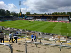Das Merck-Stadion am Böllenfalltor lädt Gästefans geradezu ein! Tolle Parkmöglichkeiten an der Technischen Universität Darmstadt, nette Ordner und einen annehmbaren Fußmarsch quer über den Campus und durch einen Wald direkt zum Gästeeingang. Als die Tore um 12 Uhr öffneten, bot sich ein Einblick in die Kategorie „Nostalgie“. Keine gemauerten Toilettenanlagen, mobiler Bierstand und eine Tribüne, die Puristen schöner nicht finden können. Eine unüberdachte Gegengerade mit einem Stehbereich für Gäste, bei dem man wunderbar das gesamte Feld überblicken kann – und das aus jeder Perspektive! Hier muss man sich als Fan nicht wie ein Straftäter fühlen, der hinter Plexiglas eingesperrt wird. Das Unkraut wuchert noch auf der Tribüne und man ist dem Wetter ausgesetzt. Daher war es wichtig und gut, dass die Sonne schien! So wie es Alberto Colucci in seiner Fanhymne für die Lilien besingt! Bratwurst, Rindswurst oder Paprikawurst und ein Bier, welches unserem geliebten Fiege recht ähnlich schmeckt. Alles war angerichtet für einen tollen Fußballnachmittag in Hessen!